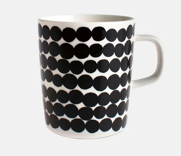 Dieser weiße Steingutbecher ist mit dem Räsymatto-Motiv in schwarz verziert.