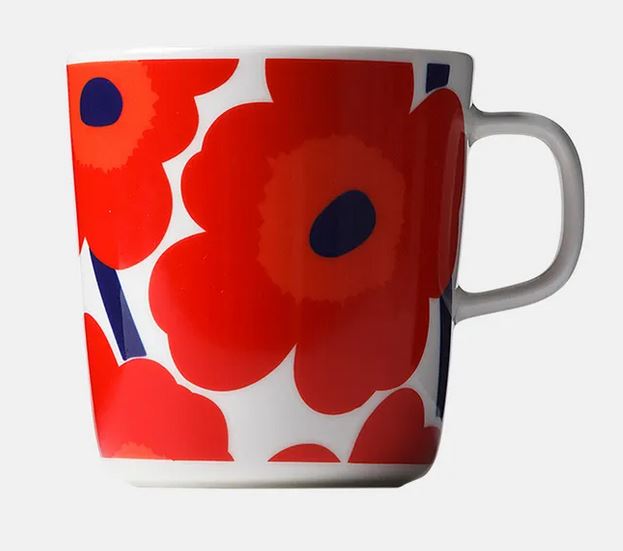 Das Unikko-Motiv in rot ziert diesen weißen Steingut-Becher.